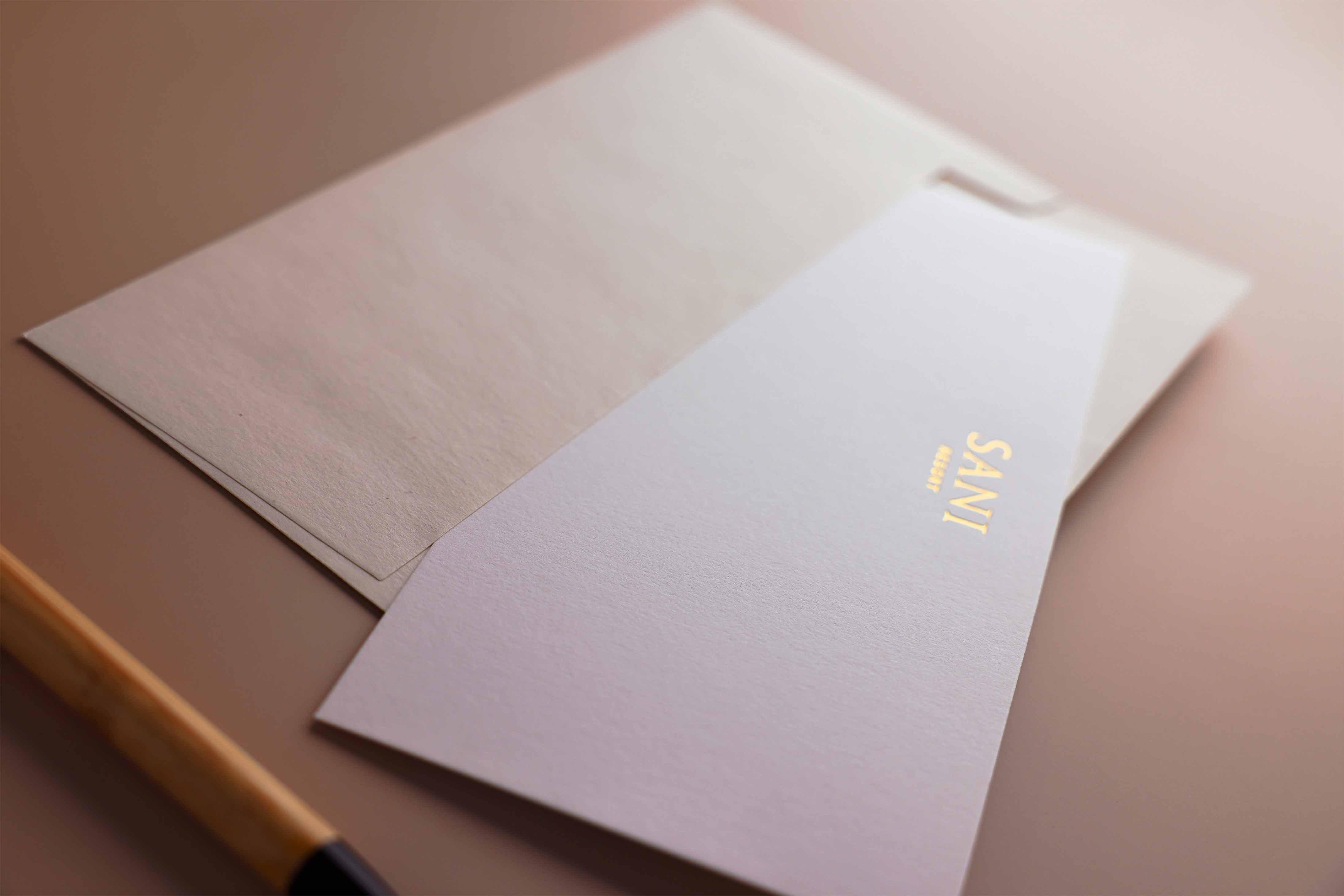 Let’s craft your extra-premium DL envelope from recycled off-white paper with gold imprint details. Even the smallest elements in your stationery collection can elevate your brand and communicate luxury.